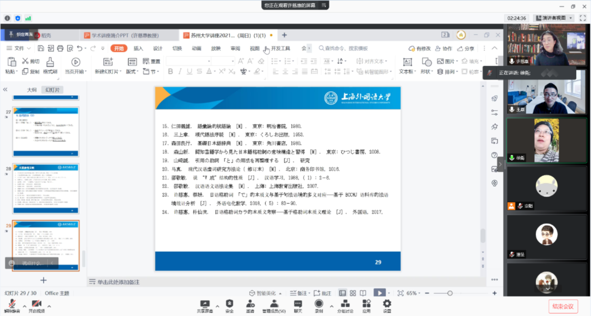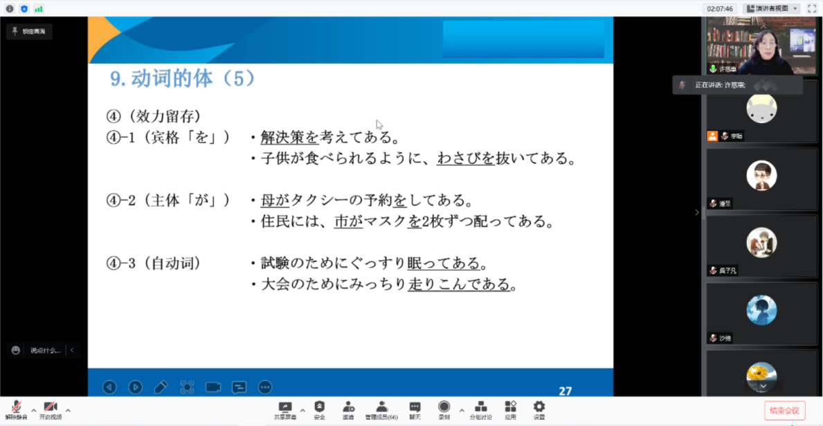 许慈惠教授深入浅出的讲解揭示并且验证了词的语义对语法句法的决定性作用,也为日语句法语义的研究、教学与习得提供了新的视角和思路。在线师生们反响热烈,深受启发。